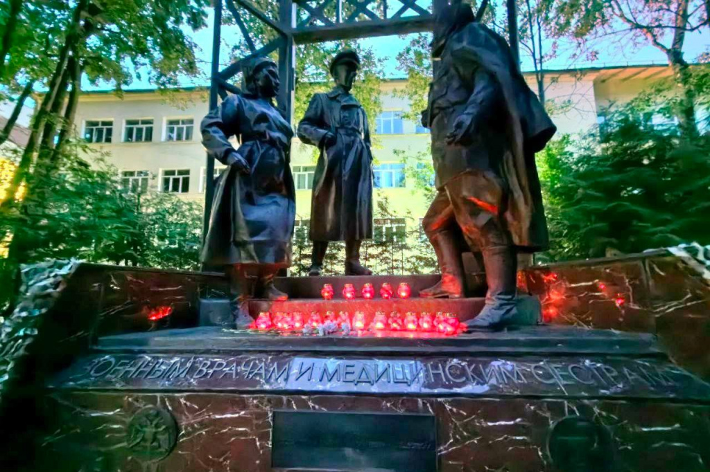 У памятника военным врачам и медсёстрам на территории института участники зажгли свечи в память о героях Великой Отечественной войны и провели минуту молчания в честь павших воинов.