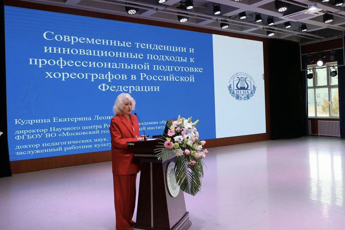 Екатерина Леонидовна выступила с докладом «Современные тенденции и инновационные подходы к профессиональной подготовке хореографов в Российской Федерации», в котором представила главные векторы обновления отечественной системы хореографического образования и обозначила перспективы её развития. Организационную и переводческую поддержку профессору Кудриной обеспечил студент 4 курса факультета музыкального искусства МГИК Хао И.